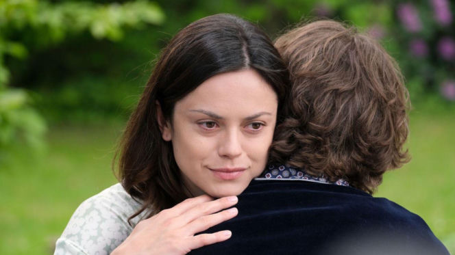 Paulina Lasota jako Kasia z serialu "M jak miłość" przytula Mateusza Mosiewicza grającego Mariusza, oboje mają ciemne włosy, a na twarzy Kasi widać brak szczęścia. Więcej o losach bohaterów na Super Seriale.