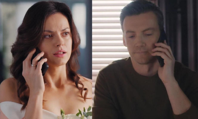 Kasia (Paulina Lasota) w sukni ślubnej i Jakub (Krzysztof Kwiatkowski) rozmawiający przez telefon. Na dłoni Kasi widoczny pierścionek, a w jej ręce bukiet ślubny. Ten moment, który wzbudza w niej wątpliwości przed ślubem z Mariuszem, można obejrzeć na stronie Super Seriale.