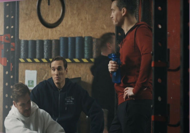 Trzej mężczyźni podczas treningu na siłowni. Olek (Maurycy Popiel) w granatowej bluzie patrzy w lewo, Jakub (Krzysztof Kwiatkowski) w czerwonej bluzie trzyma niebieską butelkę i odwraca się bokiem. Marcin (Mikołaj Roznerski) w białej bluzie siedzi na pierwszym planie. Więcej o ich losach w "M jak miłość" na Super Seriale.
