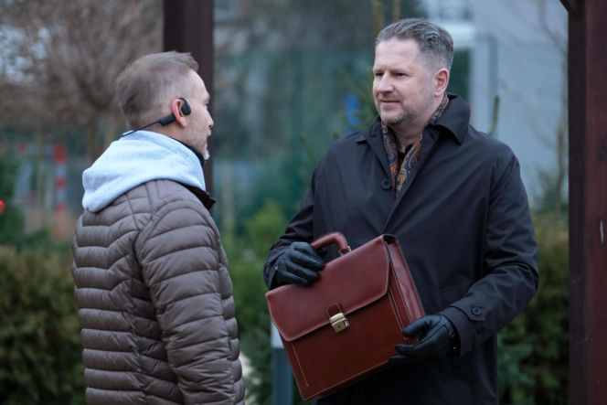 Igor Jabłoński (Marcin Piętowski) oferuje Andrzejowi Budzyńskiemu (Krystian Wieczorek) teczkę z pieniędzmi w serialu "M jak miłość". Zdjęcie to ilustruje dramatyczną scenę z odcinka 1925, gdzie prawnik mierzy się z pokusą przekupstwa. Więcej o losach bohaterów na Super Seriale.