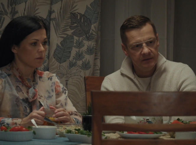 Katarzyna Cichopek (Kinga Zduńska) i Marcin Mroczek (Piotrek Zduński) siedzą przy stole, mając zmartwione miny. Przed nimi talerze z jedzeniem. Scena z serialu "M jak miłość" o problemach syna. Więcej o ich losach na Super Seriale.