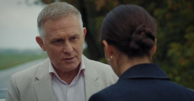 Robert Moskwa jako Artur Rogowski rozmawia z kobietą odwróconą tyłem, prawdopodobnie Joanną, w plenerze. Scena z serialu "M jak miłość" ilustruje jego zauroczenie Joanną, kiedy Paweł walczy o życie. Więcej o wątku dowiesz się na Super Seriale.