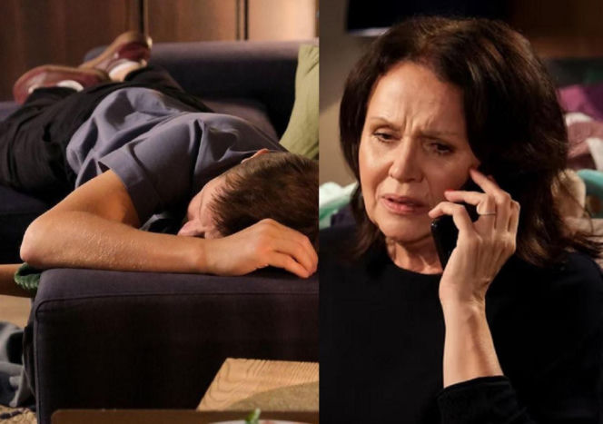 Paweł Zduński leżący nieprzytomny na kanapie i Marysia Rogowska rozmawiająca przez telefon z zatroskaną miną. Zdjęcia z serialu "M jak miłość" ilustrujące dramatyczne wydarzenia z 1926 odcinka, które czytelnicy poznają na portalu Super Seriale.