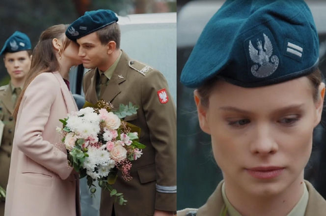 Młoda kobieta w beżowym płaszczu, trzymająca bukiet kwiatów, całuje w policzek mężczyznę w mundurze wojskowym i berecie. W tle, z rozmyciem, widać inną kobietę w mundurze wojskowym, patrzącą z niezadowoleniem, co sugeruje zazdrość Majki o Mateusza, o czym można przeczytać na Super Seriale.