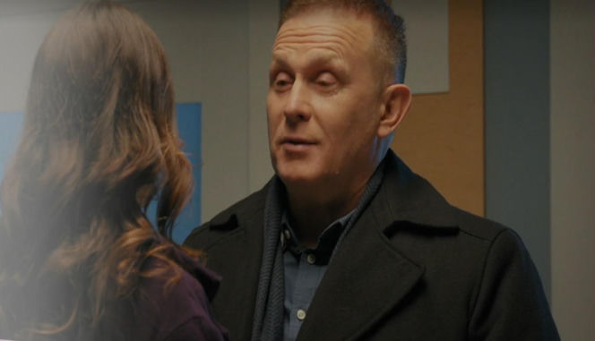 Mężczyzna w ciemnym płaszczu i szarym szaliku, Artur (Robert Moskwa), rozmawia z kobietą o brązowych włosach, Joanną (Dominika Sakowicz), widoczną z tyłu, zamyślona mina Artura może wskazywać na próbę wzbudzenia litości w Joannie. Więcej o ich relacji znajdziesz na Super Seriale.