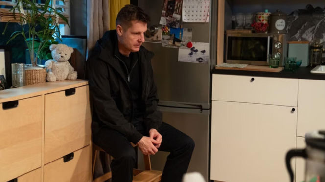 Paweł Zduński (Rafał Mroczek) w czarnej kurtce i spodniach, siedzi smutny na krześle, patrząc w lewo. Tło przedstawia wnętrze kuchni z szafkami i lodówką z przypiętymi zdjęciami. Ta scena z "M jak miłość" to zapowiedź dramatycznych wydarzeń. Więcej o losach bohatera przeczytasz na portalu Super Seriale.