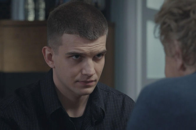 Zbliżenie na twarz Mateusza (Rafał Kowalski) z "M jak miłość", który patrzy na swoją babcię Barbarę (Teresa Lipowska), widoczną z tyłu głowy. Mateusz ma krótkie włosy, ubrany jest w ciemną koszulę. Wygląda na zamyślonego. Więcej o losach bohaterów przeczytasz na stronie Super Seriale.