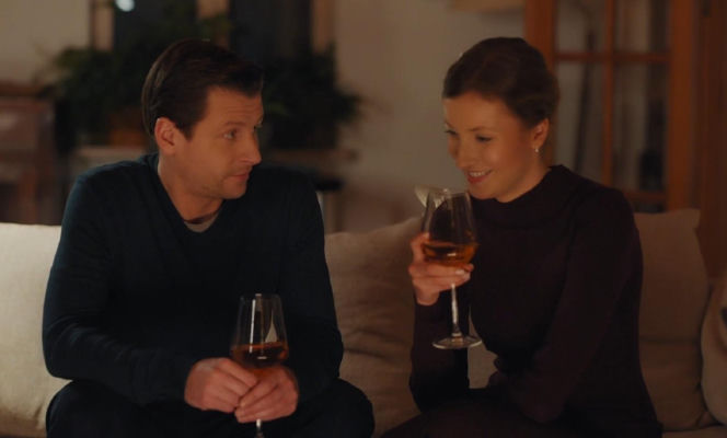 Uśmiechnięta Natalka Mostowiak (Dominika Suchecka) i Adam Karski (Patryk Szwichtenberg) siedzą razem na kanapie, trzymając kieliszki z winem. Para rozmawia, Natalka spogląda na Adama z zadowoleniem. Więcej o ich losach na Super Seriale.