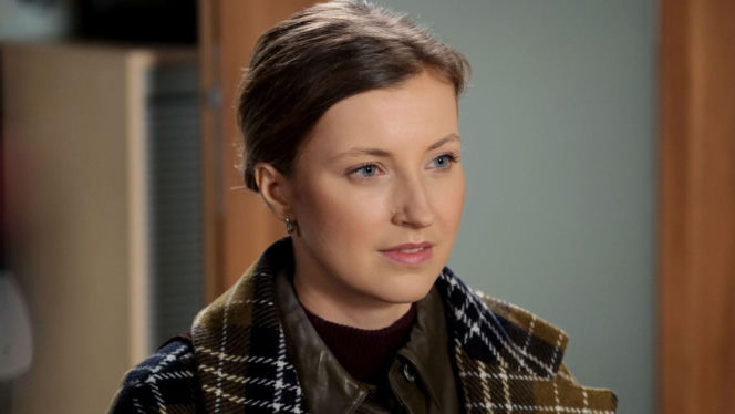 Portret Natalki Mostowiak z "M jak miłość" (Dominika Suchecka) w zbliżeniu, ukazujący jej zamyśloną minę i delikatny makijaż, ubraną w kraciastą kurtkę. Obraz odzwierciedla emocjonalny kontekst nadchodzących wydarzeń w serialu, o których przeczytasz na Super Seriale.