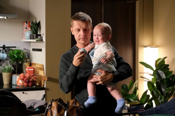 Paweł Zduński (Rafał Mroczek) trzymający płaczącego Antosia (Mark Myronenko), próbując go uspokoić błękitną grzechotką. Scena z "M jak miłość" ilustruje próbę odbudowy relacji po śmierci Franki. Więcej o tym na Super Seriale.