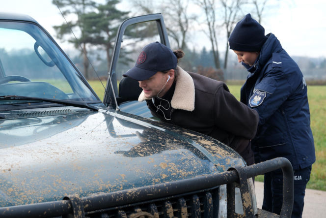 Policjantka Natalka Mostowiak z serialu "M jak miłość" zatrzymuje Mikołaja Lipińskiego, opartego o maskę brudnego, terenowego samochodu. Mikołaj w czarnej kurtce z jasnym kołnierzem, czapce z daszkiem i słuchawkami, ma kajdanki na rękach. Więcej o ich znajomości przeczytasz na Super Seriale.