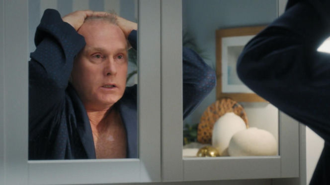 Artur Rogowski (Robert Moskwa) z "M jak miłość" z rozdartą miną patrzy w lustro, trzymając ręce na głowie. Scena podkreśla jego dylemat między rodziną a Joanną, o czym przeczytasz więcej na Super Seriale.