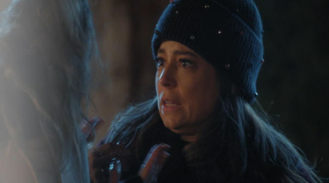 Bliskie ujęcie Pauliny (Maria Wieczorek) z serialu "M jak miłość", noszącej ciemną czapkę z ozdobami i futrzany kołnierz, z widocznym wyrazem lęku i rozpaczy na twarzy, być może podczas brutalnego ataku na Magdę (Anna Mucha). Więcej informacji na Super Seriale.