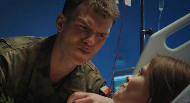 Tomek (Chris Cugowski) w wojskowym mundurze z polską flagą na ramieniu, pochylający się nad Majką (Matylda Giegżno) leżącą w szpitalnym łóżku. Tomek ma zagniewaną minę, a w tle widać kroplówkę. Więcej o ich dramatycznej historii na stronie Super Seriale.