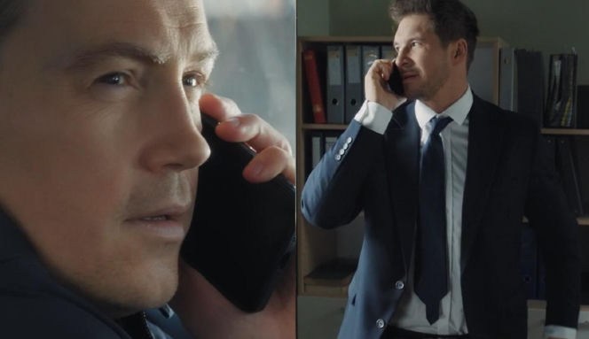 Mężczyzna w niebieskiej marynarce rozmawia przez telefon, patrząc z zamyśleniem. Obok niego, drugi mężczyzna w garniturze również prowadzi rozmowę telefoniczną, stojąc w biurze. Marcin i Jakub w nowej pracy w „M jak miłość”. Obejrzyj te i inne Super Seriale.