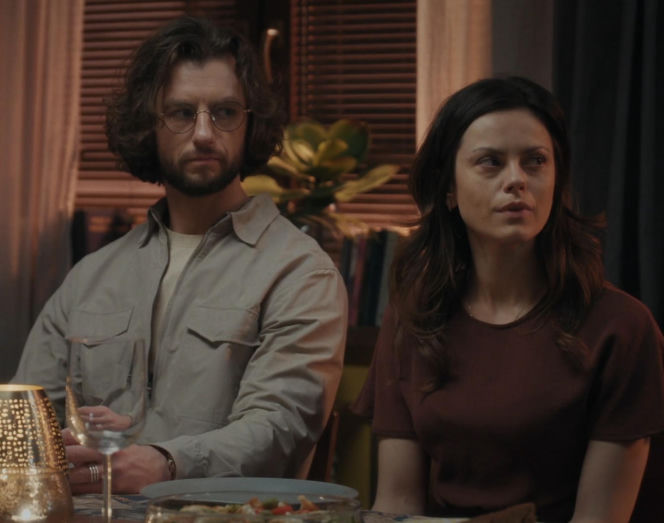 Mariusz (Mateusz Mosiewicz) i Kasia (Paulina Lasota) siedzą przy stole. Mariusz, z brodą i okrągłych okularach, ma na sobie beżową koszulę. Kasia w brązowej bluzce, z długimi włosami, patrzy w prawo. Przed nimi kieliszek i talerz. Więcej informacji o serialu "M jak miłość" znajdziesz na Super Seriale.