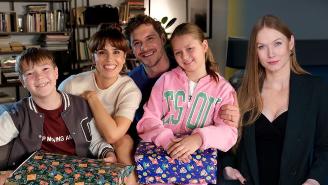Rodzina Marcina Chodakowskiego z "M jak miłość" – Kama, dzieci i on sam – cieszy się wspólną chwilą, podczas gdy po prawej stronie, na osobnym tle, pojawia się Katarzyna Dąbrowska jako Elżbieta Domańska, nowa prezes. Więcej o nowej roli Dąbrowskiej na Super Seriale.