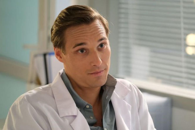 Aktor Mikołaj Krawczyk w roli Sowińskiego, antagonisty w serialu "M jak miłość". Sowiński, nowy szef Olka, patrzy z ironicznym uśmiechem, ubrany w niebieską koszulę i biały kitel. Tło stanowią pionowe żaluzje. Więcej o wątku w Super Seriale.