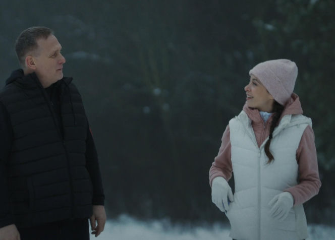 Artur (Robert Moskwa) i Joanna (Dominika Sakowicz) podczas potajemnego spotkania w lesie, oboje ubrani w zimowe kurtki i czapki, stoją na śniegu, patrząc na siebie z uśmiechem. Mężczyzna jest w czarnej puchowej kamizelce, a kobieta w białej. Więcej o schadzce Artura z Joanną w lesie przeczytasz na Super Seriale.