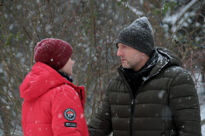 Bartek (Arkadiusz Smoleński) w szarej czapce i zielonej kurtce rozmawia z Frankiem (Jarosław Śmigielski) w czerwonej czapce i czerwonej kurtce, stojąc wśród ośnieżonych krzewów podczas opadów śniegu. Franek patrzy na Bartka, a Bartek na wprost. Więcej o ich losach na Super Seriale.