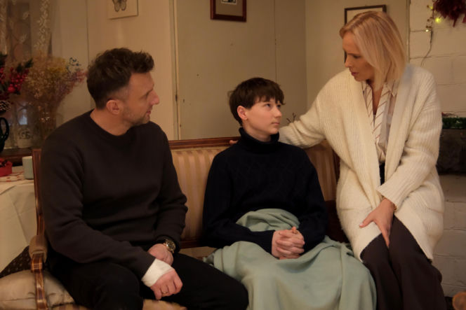Młody Franek (Jarosław Śmigielski) z serialu "M jak miłość" ze spuszczoną głową obok swojego ojczyma Marcina Sitka, który patrzy na niego z wyraźną groźbą, trzymając rękę na jego ramieniu. Scena przedstawia trudną sytuację chłopca, który boi się brutalnego Zawadzkiego. Więcej o dramatycznych losach bohaterów przeczytasz na Super Seriale.