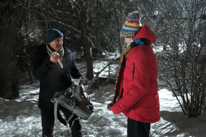 Franek (Jarosław Śmigielski) w zimowej czapce i czerwonej kurtce oddaje ojczymowi (Marcin Sitek) skradzione złote naszyjniki i pieniądze w ośnieżonym lesie. Ojczym trzyma gotówkę i plecak. Więcej o dramatycznych wydarzeniach w "M jak miłość" przeczytasz na Super Seriale.