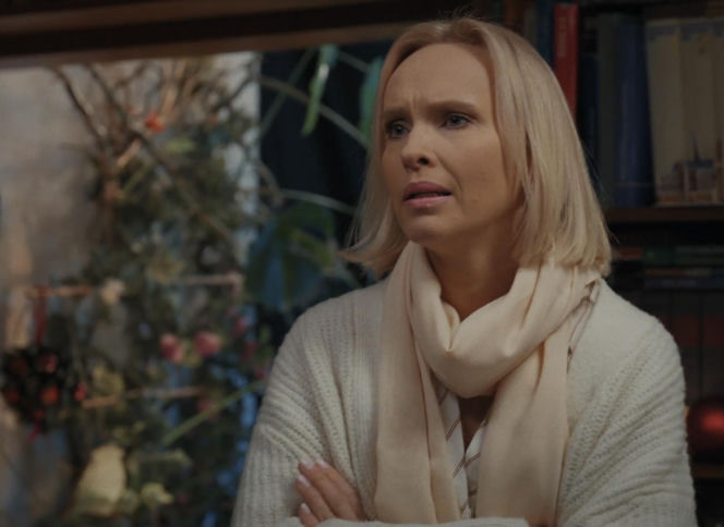 Dorota (Iwona Rejzner) z serialu "M jak miłość" zaniepokojona zniknięciem Franka, w białym swetrze i jasnym szaliku. Jej zatroskany wyraz twarzy odzwierciedla dramatyczną walkę o życie zaginionego dziecka, o czym czytać można na portalu Super Seriale.