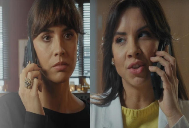 Portretowe ujęcie z podziałem, ukazujące Kamę (Michalina Sosna) i Anetę (Ilona Janyst) podczas rozmowy telefonicznej. Kama ma poważny wyraz twarzy, Aneta wyraźnie mówi. Zdjęcie przedstawia kluczowy moment z serialu "M jak miłość", o którym więcej można przeczytać na Super Seriale.