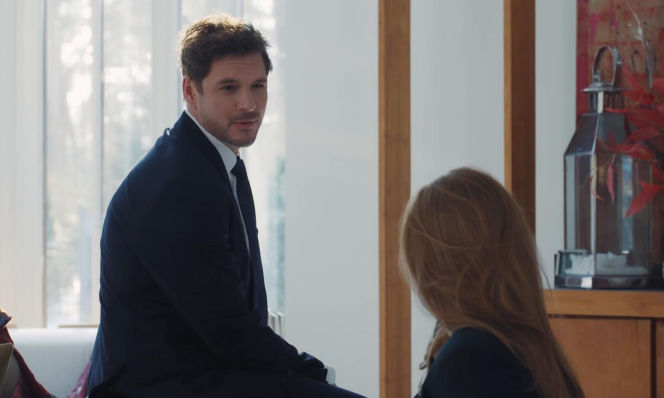 Mikołaj Roznerski jako Marcin Chodakowski w granatowym garniturze z krawatem, siedzący tyłem do okna, spogląda w prawo na Elżbietę Domańską (Katarzyna Dąbrowska) z długimi blond włosami, której widać tylko tył głowy. Scena z serialu "M jak miłość" na Super Seriale.