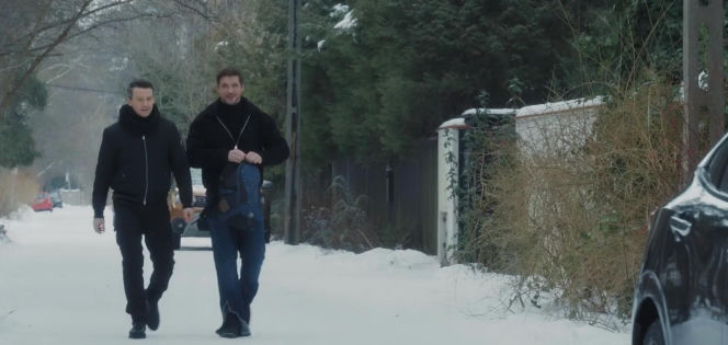 Aktorzy Mikołaj Roznerski jako Marcin i Krzysztof Kwiatkowski jako Jakub idą w zimowym plenerze, na tle zaśnieżonych krzewów i drzew. Marcin trzyma niebieski plecak. Obaj ubrani są w ciemne, zimowe kurtki i spodnie. Scena z serialu "M jak miłość", o którym możesz przeczytać na Super Seriale.
