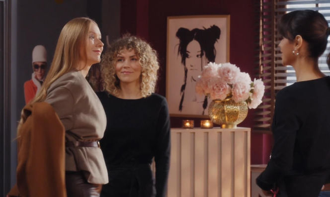 Katarzyna Dąbrowska jako Elżbieta w beżowej stylizacji, obok niej Michalina Sosna jako Kama w czarnym stroju, z uśmiechem witająca Elżbietę w salonie fryzjerskim. Na ścianie za nimi nowoczesna grafika i wazon z różowymi peoniami. Emocjonująca konfrontacja bohaterek serialu "M jak miłość" na Super Seriale.