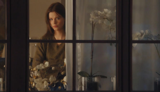 Matylda Giegżno jako Majka w serialu "M jak miłość", patrząca przez okno z refleksją i smutkiem na twarzy, z białymi orchideami w tle. Majka jest pogrążona w dramacie miłosnym, który zostanie rozwiązany w 1933 odcinku, o czym przeczytasz na stronie Super Seriale.