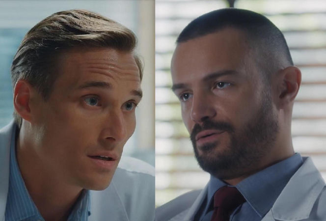 Cztery osoby w białych fartuchach i niebieskim stroju medycznym podczas spotkania w gabinecie. Mężczyzna z lewej, Mikołaj Krawczyk jako Aleksander Sowiński, spogląda w dół, a Maurycy Popiel jako Olek Chodakowski siedzi przy biurku z dokumentami. W tle widoczne są zdjęcia rentgenowskie, charakterystyczne dla kliniki w "M jak miłość". Więcej o losach bohaterów przeczytasz na Super Seriale.