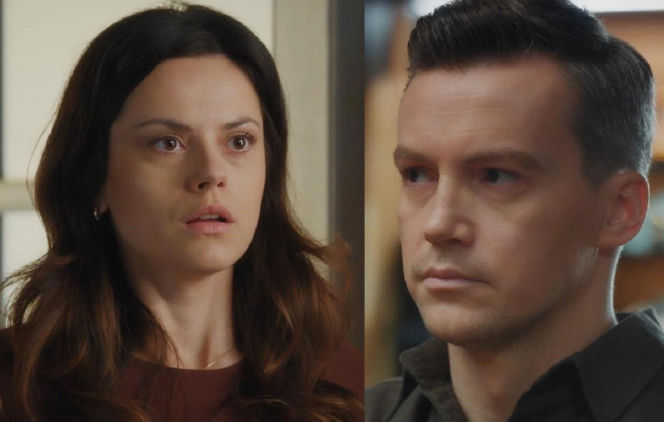 Paulina Lasota jako Kasia z wytrzeszczonymi oczami i Krzysztof Kwiatkowski jako Jakub z poważną miną w „M jak miłość”. Scena z serialu, w której prawda o ojcostwie Zosi wyjdzie na jaw. Więcej o ich losach na stronie Super Seriale.