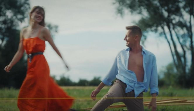 Dominika Kachlik (Franka) w zwiewnej, pomarańczowej sukience i Rafał Mroczek (Paweł) z rozpiętą koszulą na tle zieleni, uśmiechający się do siebie, symbolizujący romantyczny piknik i rodzącą się namiętność w jubileuszowym odcinku "M jak miłość". Więcej o ich losach na Super Seriale.
