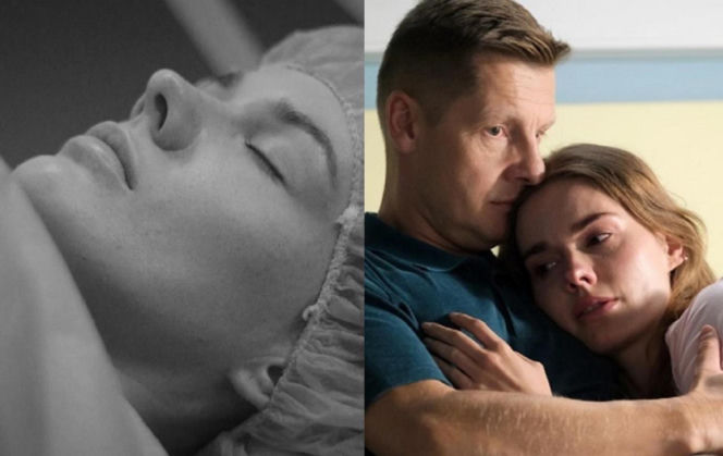 Aktorka Dominika Kachlik jako Franka w czarno-białym ujęciu, leżąca z zamkniętymi oczami w czepku medycznym, obok Rafał Mroczek jako Paweł obejmujący Frankę, która ma łzy w oczach. Sceny z serialu "M jak miłość" dostępne na Super Seriale.