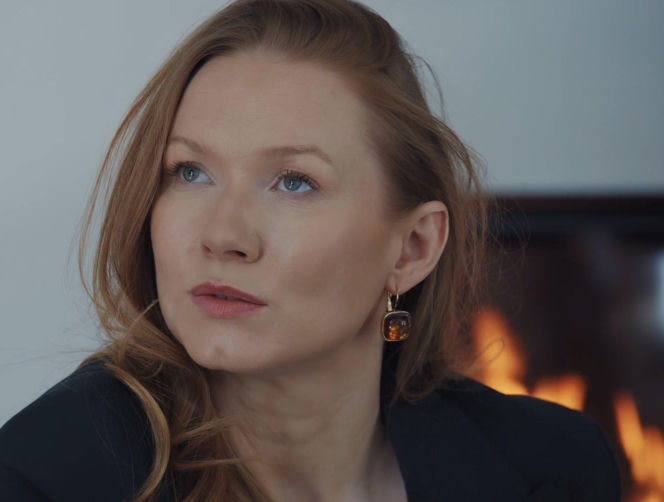 Katarzyna Dąbrowska jako Elżbieta Domańska, nowa szefowa Marcina z rudymi włosami, błękitnymi oczami i wyrazistym makijażem, w czarnej marynarce i kolczykami, spoglądająca w bok. Obok jej twarzy widać delikatny błysk ognia kominka, a całe zdjęcie odzwierciedla intrygującą postać, o której można przeczytać na Super Seriale.