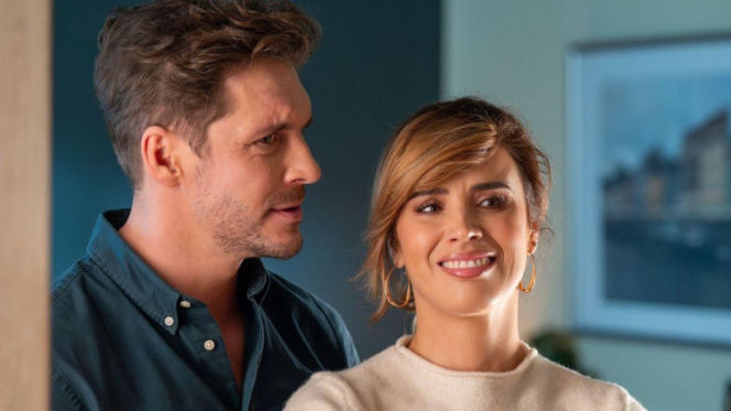 Uśmiechnięta Michalina Sosna jako Kama w białym swetrze i złotych kolczykach, obok niej Mikołaj Roznerski jako Marcin, patrzący na nią z troską. Aktorzy z serialu "M jak miłość" pokazują relacje między bohaterami, o których przeczytasz więcej na portalu Super Seriale.