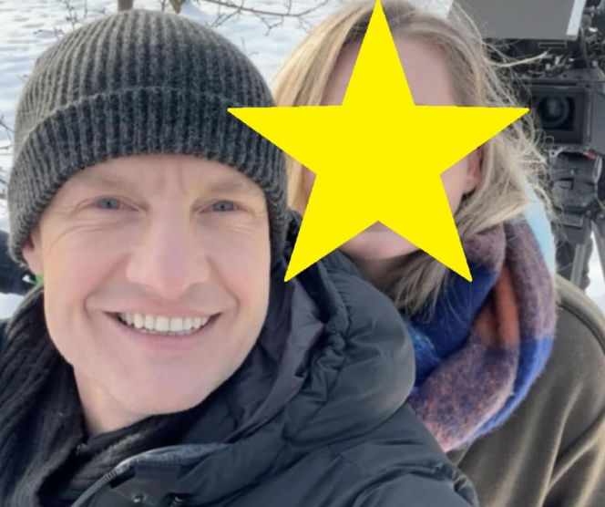 Rafał Mroczek jako Paweł Zduński uśmiecha się na pierwszym planie, w tle niewyraźna postać Pauliny Chruściel. Aktorzy „M jak miłość” są na śniegu, Mroczek ma szarą czapkę i czarną kurtkę, jego koleżanka barwny szalik. Szczegóły dotyczące serialu znajdziesz na Super Seriale.