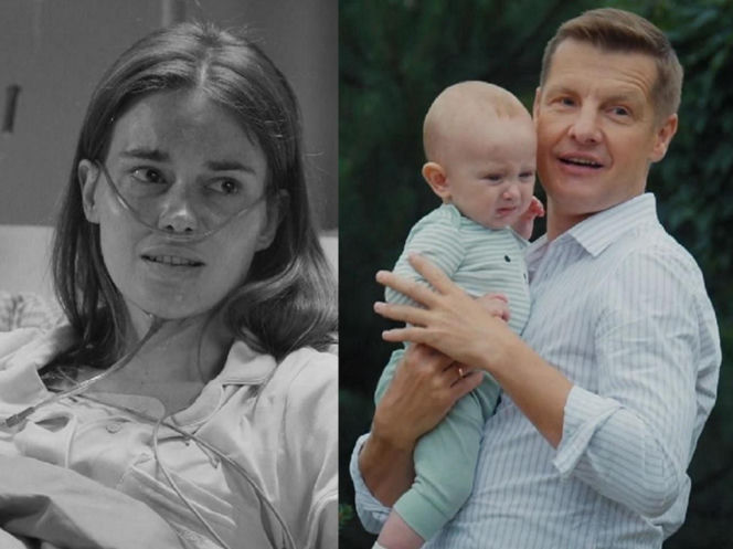 Podzielone zdjęcie: po lewej stronie Dominika Kachlik jako Franka w szpitalu z rurką tlenową w nosie, po prawej uśmiechnięty Rafał Mroczek jako Paweł trzymający na rękach Marka Myronenkę jako Antosia. Artykuł na Super Seriale omawia, kto pomoże Pawłowi wychować Antosia po śmierci Franki.