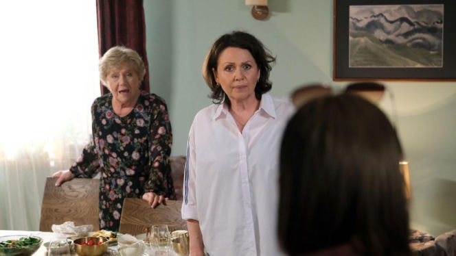 Teresa Lipowska jako Barbara Mostowiak w ciemnej kwiecistej sukience i Małgorzata Rożniatowska jako serialowa Kisielowa w białej koszuli patrzą w stronę widza. Zdjęcie ilustruje zmiany w "M jak Miłość", o których czytać można na portalu Super Seriale.