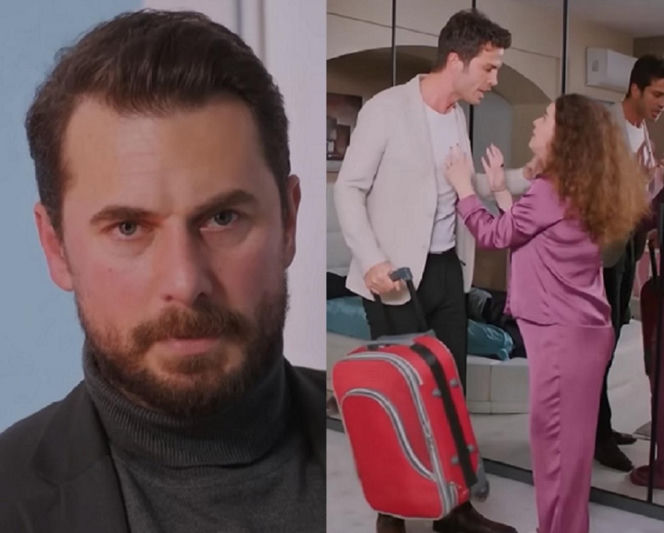 Portret Kuzeya z tureckiego serialu "Miłość i nadzieja" w szarym golfie i marynarce, obok Ege pakującego walizkę i Melis próbującej go zatrzymać. Sceny z emocjonujących odcinków 361-364 dostępne na stronie Super Seriale.
