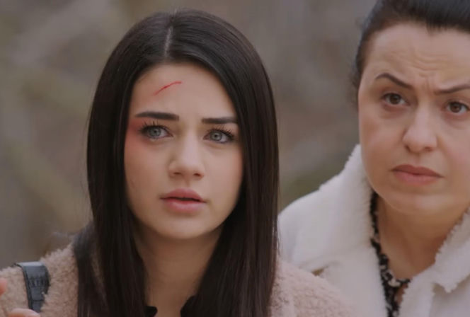 Bahar ze świeżą raną na czole i rozmazanym makijażem, z widoczną łzą w oku, patrzy w dal z determinacją. Za nią widać twarz Cavidan, która zaniepokojona spogląda w prawą stronę. Kobiety spiskują, aby pokrzyżować zaręczyny w serialu "Miłość i nadzieja", o czym więcej na Super Seriale.