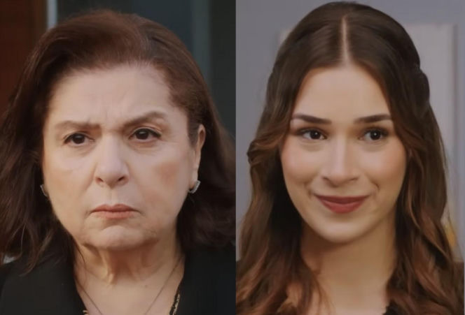 Naciye z groźną miną po lewej i uśmiechnięta Sila po prawej, wyrażające konflikt między postaciami serialu "Miłość i nadzieja". Naciye w końcu zgodzi się na ślub Sili i Kuzeya. Więcej o tym na Super Seriale.