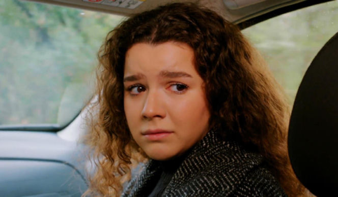 Młoda kobieta o kręconych, brązowych włosach, ubrana w ciemny płaszcz w jodełkę, siedzi w samochodzie, patrząc w bok z wyraźnym niepokojem i smutkiem. Jej mina odzwierciedla napięcie z 362. odcinka serialu „Miłość i nadzieja”, gdzie Melis przeżywa trudne chwile. Obejrzyj ten i inne Super Seriale.