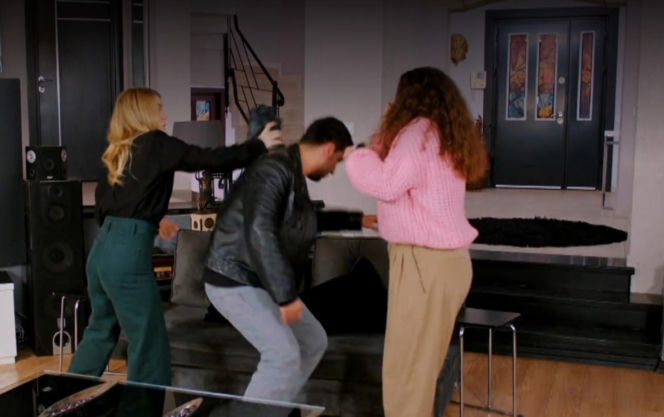 Mężczyzna w czarnej skórzanej kurtce i kobieta w różowym swetrze, Gokhan i Melis, stoją twarzą w twarz, spierając się. Gokhan wyciąga rękę w stronę Melis, która stoi z zaciętą miną, w tle drzwi. Zbliża się emocjonujące starcie w serialu "Miłość i nadzieja" – więcej na Super Seriale.