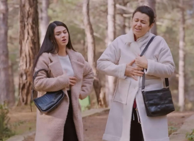 Kadr z serialu "Miłość i nadzieja" przedstawiający Bahar i Cavidan w parku. Kobiety w płaszczach stoją obok siebie z dłońmi na brzuchach, z wyraźnym grymasem paniki i strachu na twarzach. Długie, ciemne włosy Bahar kontrastują z jaśniejszym okryciem Cavidan. Więcej o ich intrygach znajdziesz na Super Seriale.