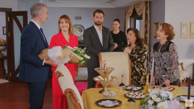 Scena z tureckiego serialu „Miłość i nadzieja” przedstawiająca grupę elegancko ubranych osób na spotkaniu w pomieszczeniu. Mężczyzna w garniturze wręcza bukiet kwiatów uśmiechniętej kobiecie w czerwonej sukience. Na stole widoczne są ciasta i dekoracje. Więcej o losach bohaterów na Super Seriale.