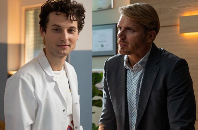 Kamil Zawada (Jakub Łopatka) w białym kitlu i Maks Beger (Tomasz Ciachorowski) w garniturze. Zdjęcie przedstawia dwóch aktorów z serialu "Na dobre i na złe", którego nowe odcinki i streszczenia znajdziesz na Super Seriale.
