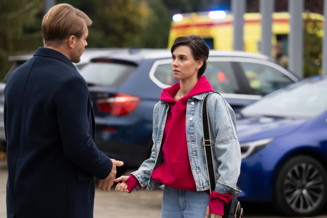 Pola Gonciarz jako Blanka i Tomasz Ciachorowski jako Beger na zewnątrz szpitala w Leśnej Górze, rozmawiający o jej zwolnieniu z pracy. Blanka, w różowej bluzie i jeansowej kurtce, patrzy na Begera, który wyciąga w jej stronę otwartą dłoń. W tle widać karetkę pogotowia. Więcej informacji o serialu „Na dobre i na złe” znajdziesz na Super Seriale.